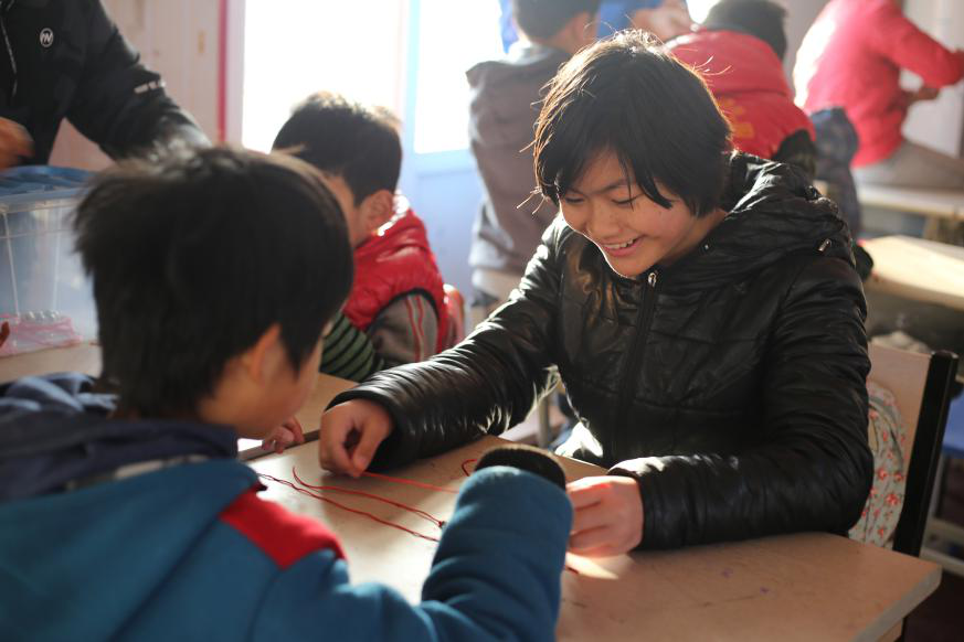 各小组志愿者们和老师们耐心具体地讲解每一个步骤,孩子们团围在志愿者们和老师的身旁,专心致志的观察每一个步骤的编织方法,孩子们认真留意编织的顺序,照着哥哥姐姐们的方法摸索着,认真的孩子们时不时的提出各种问题,把志愿者们忙得不可开交。“老师,这个怎么开头啊”“你这条线编的不对,我来帮你”“这条线应该是一圈”“哥哥这个我不会了,你能帮帮我吗”,孩子们,积极提问,互相帮助,欢乐顿时洋溢着整个教室。