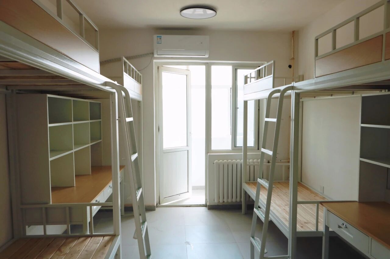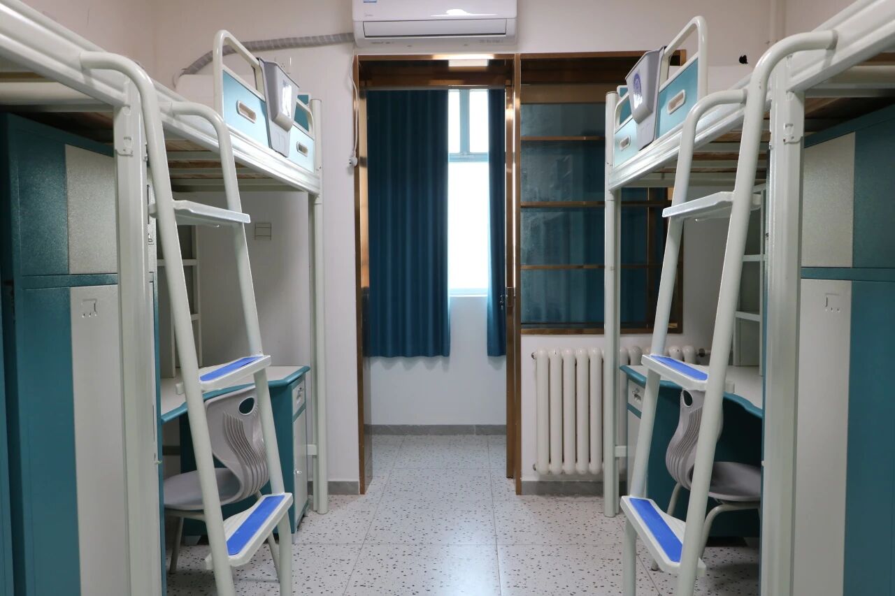 宿舍更换新床具、洗手池与空调,还配置了新的储物柜与置物架,大幅提升居住品质。灰白与浅蓝配色清爽明亮,为同学们营造更加温馨、现代的休息空间。