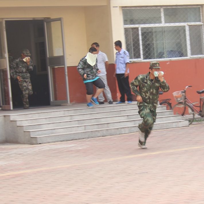 哨声响起,学生们用湿毛巾捂住口鼻,弯腰俯身并按照指定的逃生路线迅速有序地从宿舍撤离,并在指定区域完成集合。