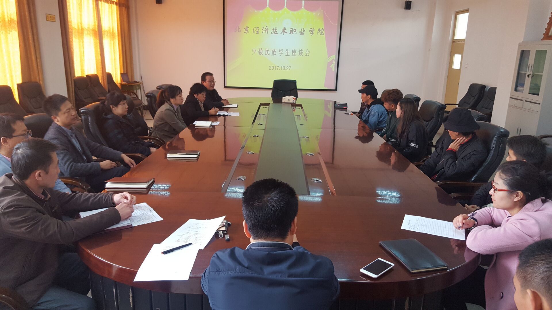 10月27日,我校2017年少数民族代表座谈会在二楼会议室召开,学校6名藏族学生参加了本次会议,学院领导张国强助理了解了少数民族学生在校学习情况、生活情况和就业准备情况,询问同学们是否收看了十九大习主席的报告,学生们纷纷进行了发言,表示学习生活顺利,就业准备工作做的比较充分,对习主席十九大报告也进行了收看,对近些年政府关怀少数民族地区发展,学生家乡生活情况进行了介绍。张助理勉励同学们要努力学习,学有所成,为建设家乡,促进民族团结多做贡献。党政办、教务处、学工处、安全保卫处、团委负责人、二级学院副院长、辅导员代表、资助中心老师参加了本次会议,会议由学工处处长索桂芝主持。