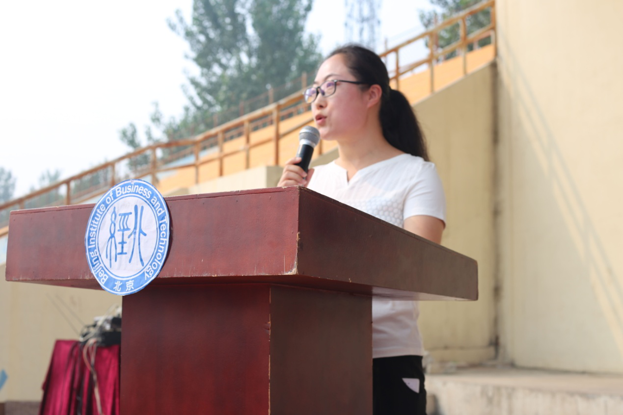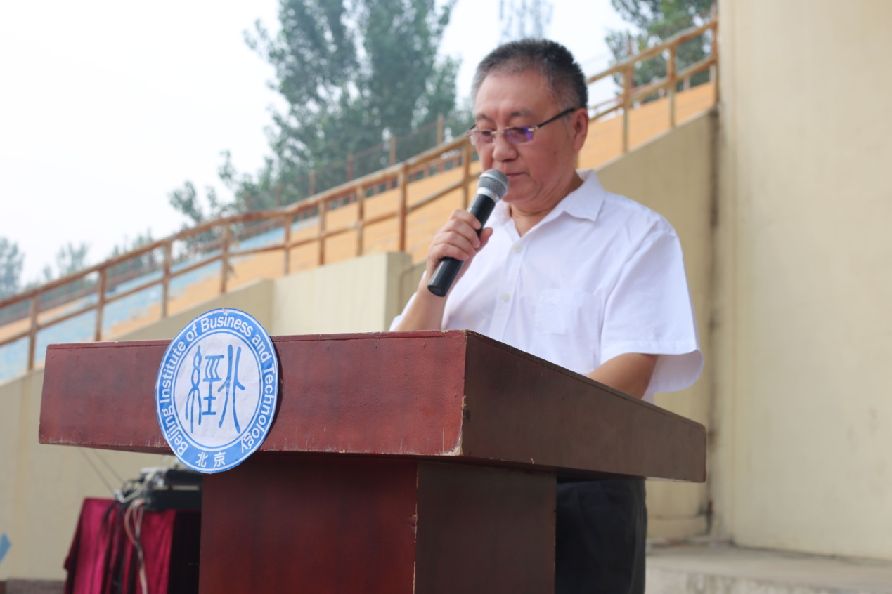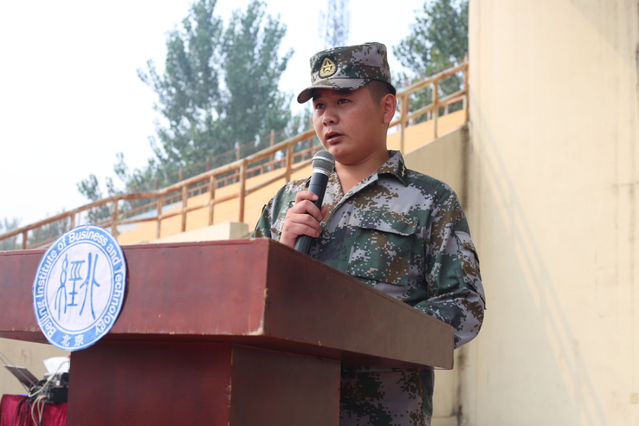 北京市教委党建联络员、教育教学督导宋海宁同志讲话。他代表北京市教委向来自祖国大江南北的新同学们加入北经院这个大家庭表示祝贺和欢迎。他指出了学生参加军训的重要意义,并告诉大家要追求自己新的人生梦想、实现真正意义上的成功,在大学学习中,不仅要掌握知识、培养能力、增长智慧、提高修养,更要养成勤奋和诚信的习惯,它是我们每个人的成功之基,是我们改变自我、改变人生格局的钥匙,更是实现自我价值、创造美好未来的不二途径。再过3年,就是建党100年,同学们已经毕业走向社会,我国也将进入创新性国家行列,正需要你们大展身手,建功立业;再过30年,即将迎来新中国成立100周年,同学们已经风华正茂,我国将成为世界科技强国,那时的你们已是祖国建设的中坚,让我们从今天开始,从这里一起出发,用你们的勤奋和诚信,走出你们自己人生的精彩、去实现国家“两个百年”的奋斗目标和中华民族的伟大复兴!