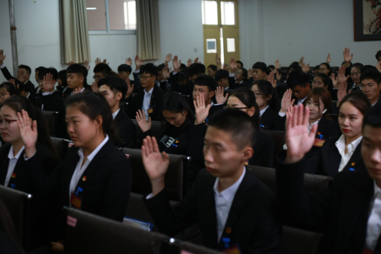 高举习近平新时代中国特色社会主义思想伟大旗帜,深入学习贯彻党的十九大精神、习近平总书记系列重要讲话精神和团的十八大精神,认真贯彻落实中央党的群团工作会议精神,立足学院“十三五”发展建设规划,锐意进取、开拓创新,团结带领全校广大团员青年不忘初心跟党走,为把学校建设成为高水平特色高职院校贡献青春力量。
