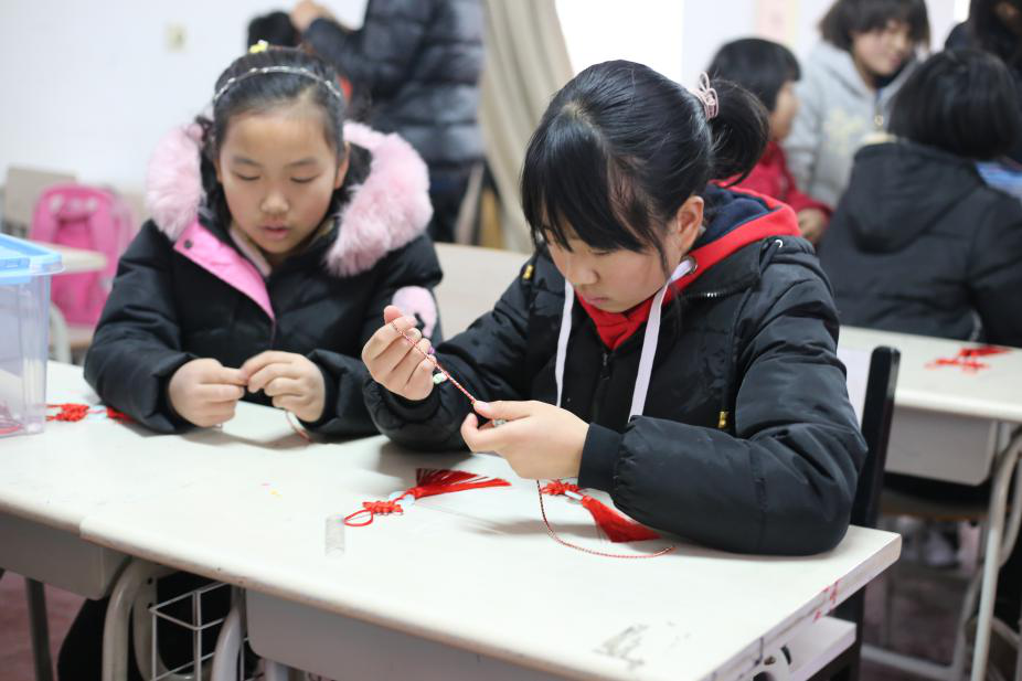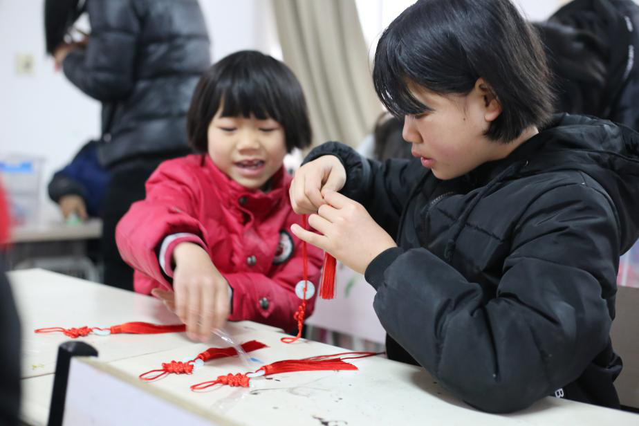 正式的课程开始了,孩子们显然已经比上周更加熟悉编织材料和编织流程,他们在志愿者的引导下一步一步的编,遇到问题也会勇敢发问,总是出现孩子们把老师们围起来“提问”的场景,孩子们不拥不挤、有序提问,编好了好看的中国结便自信的展示给我们,整个教室很快就变成了一个有爱的“编织小课堂。”