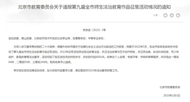 为深入学习宣传贯彻党的二十大精神,北京市教育委员会根据中央和市委关于加强社会主义法治文化建设的工作部署,于2022年5月,在全市各级各类学校中启动了第九届全市师生法治教育作品征集活动。2022年征集活动突出宪法教育主题,关注法治教育与艺术创作特色,关注民法典、依法科学防疫、青少年自护、家庭教育等法治宣传。