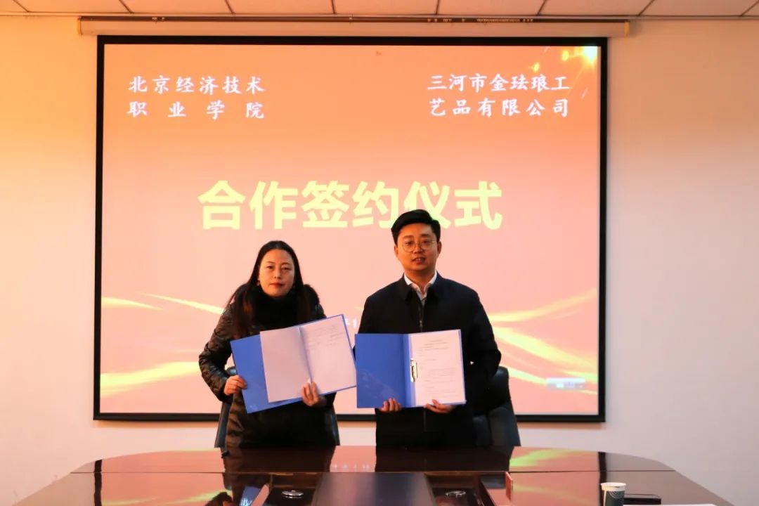 为继承和弘扬中华民族优秀传统文化,1月4日,beat365中文官方网站与三河市金珐琅工艺品有限公司校企合作签约仪式在学院第一会议室举行。学院院长周川及相关部门负责人,廊坊市级非遗代表性传承人、三河市金珐琅工艺品有限公司总经理张金香出席签约仪式。
