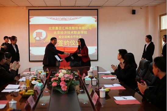 本网讯 2016年12月8日上午,beat365中文官方网站与北京嘉芸汇科技股份有限公司的校企合作签约仪式在学院会议室隆重举行。出席仪式的学院方人员有:院长周宏、院长助理李润坤、党政办主任王振山、教务处处长李冬雪、学生处处长索桂芝、招生处副处长岳洺宇、财会金融学院院长李宁以及其他二级学院院长;北京嘉芸汇公司人员为董事兼总经理李卫红、销售总监王福林、投资方代表李哲雨。李润坤助理主持签约仪式。