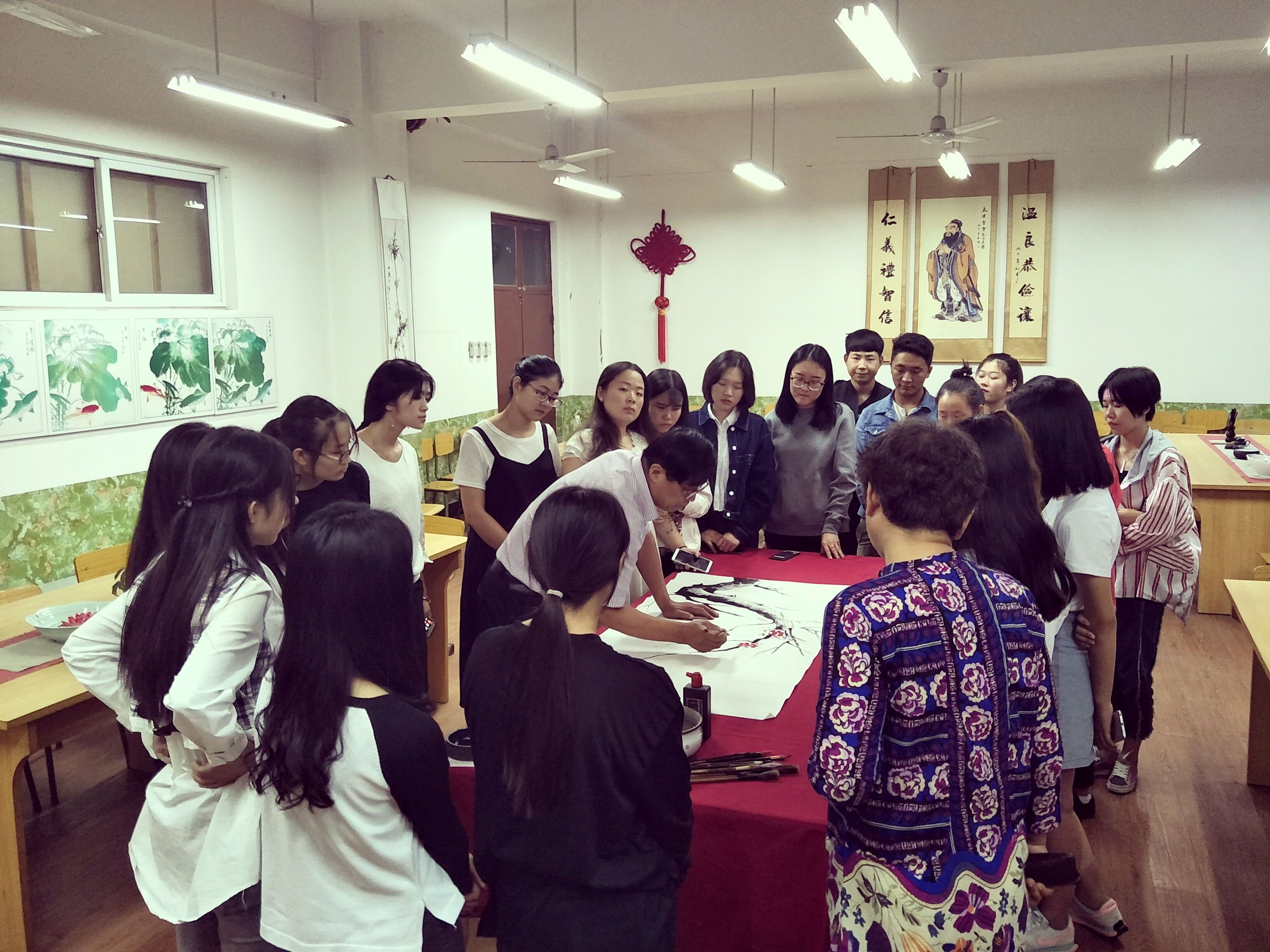 孙教授毕业于天津美术学院,功底深厚,气度十足。课堂上,孙教授细致而不失风趣的概述了梅兰竹菊在国画中的地位及其产生的作用和影响,他铺开笔墨当堂展示梅的画法,一是为了更加形象的讲述画技,二是带领学生走入国画的世界,领略寒梅之傲美。伴着悠扬的古典乐曲,同学们围在孙教授周围,沉浸在他笔下梅花绰约的风姿中……