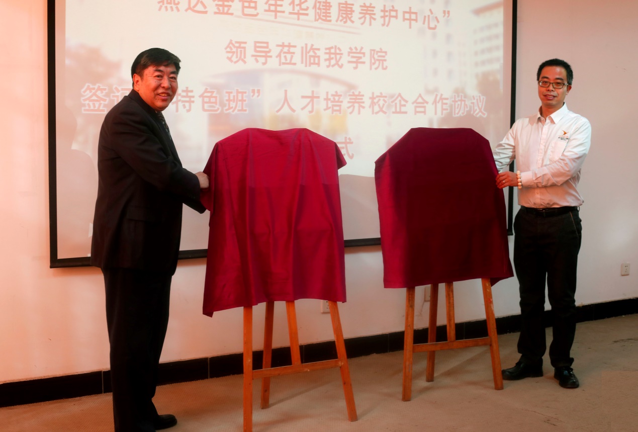 仪式上,双方分别签署了《校企合作协议书》,并共同为“燕达金色年华健康养护中心人力资源培训基地”、“beat365中文官方网站校外实训基地”揭牌。