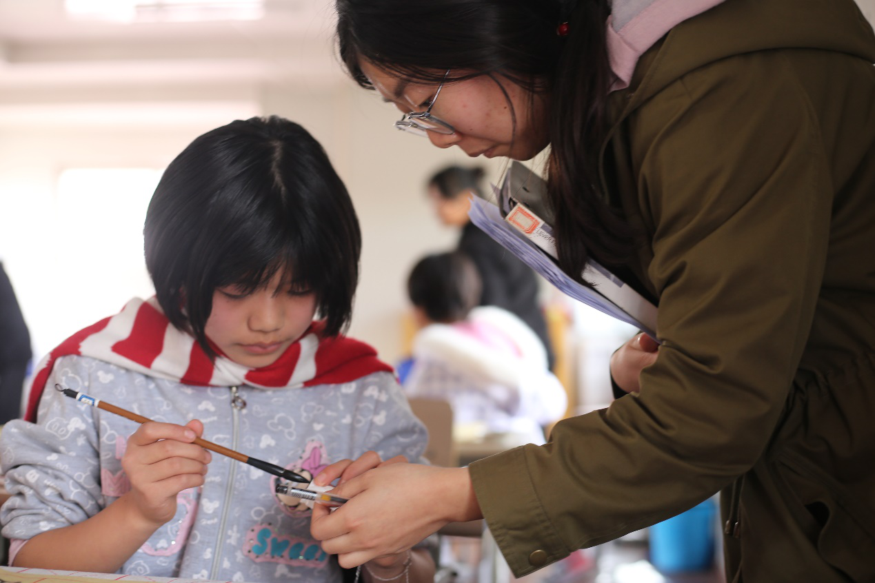因为熟悉毛笔,写字就如飞一般快,孩子毕竟是急躁的,开始毛笔拿得五花八门,写的字也歪歪扭扭,完全忘却了老师的话。可面对自己写字出错时又变得懊悔和沮丧,老师和志愿者们耐心的帮助和鼓励使他们很开心同时也有了自信心。