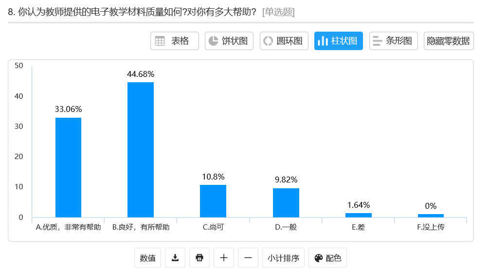 为了进一步了解学生线上学习效果,督导室还特意制定了学生调查问卷,并通过学生信息员的力量,向2018、2019级有在线学习任务的班级发布了调查问卷。问卷共回收了611份,学生参评率超于总人数的70%。