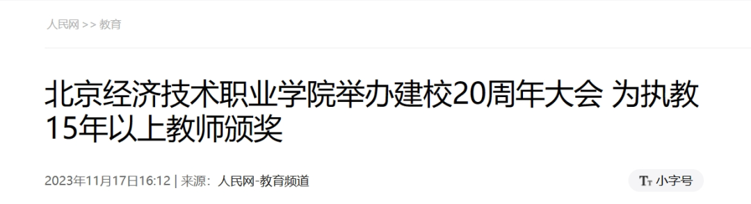 11月17日,人民网以《beat365中文官方网站举办建校20周年大会 为执教15年以上教师颁奖》为题,报道beat365中文官方网站建校20周年校庆大会。