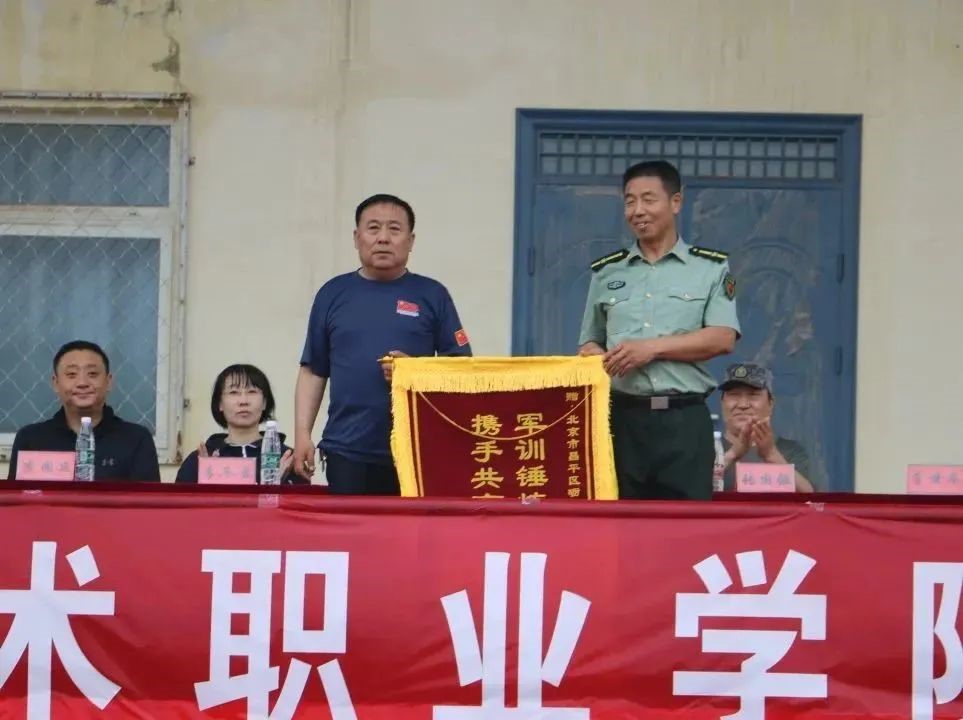 校长助理范福厚同志代表学校向承训基地赠送锦旗,感谢北京昌平励志国防教育培训学校对我校军训工作的大力支持。